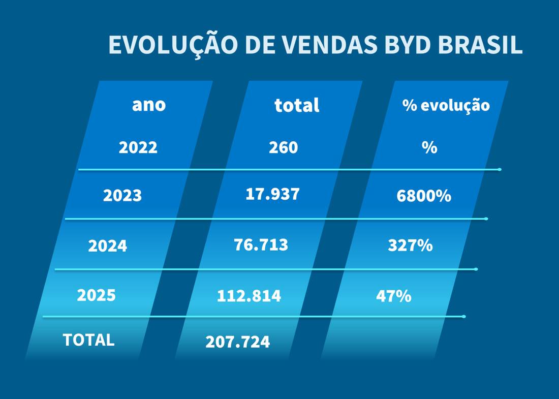 A trajetória da BYD no Brasil é notável: ao chegar ao país em 2022, a montadora vendeu apenas 260 veículos. No ano seguinte, em 2023, registrou um salto expressivo de 6.800%, com cerca de 17 mil carros emplacados. Já em 2024, a empresa consolidou seu crescimento no mercado brasileiro ao superar 76 mil veículos eletrificados vendidos, um recorde histórico. Em 2025, a BYD manteve sua curva ascendente e alcançou a marca de mais de 112 mil carros eletrificados vendidos em um único ano, reforçando sua posição como uma das marcas que mais crescem no setor automotivo no Brasil.