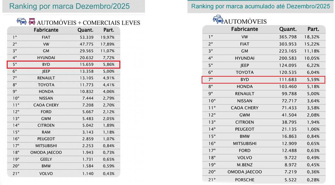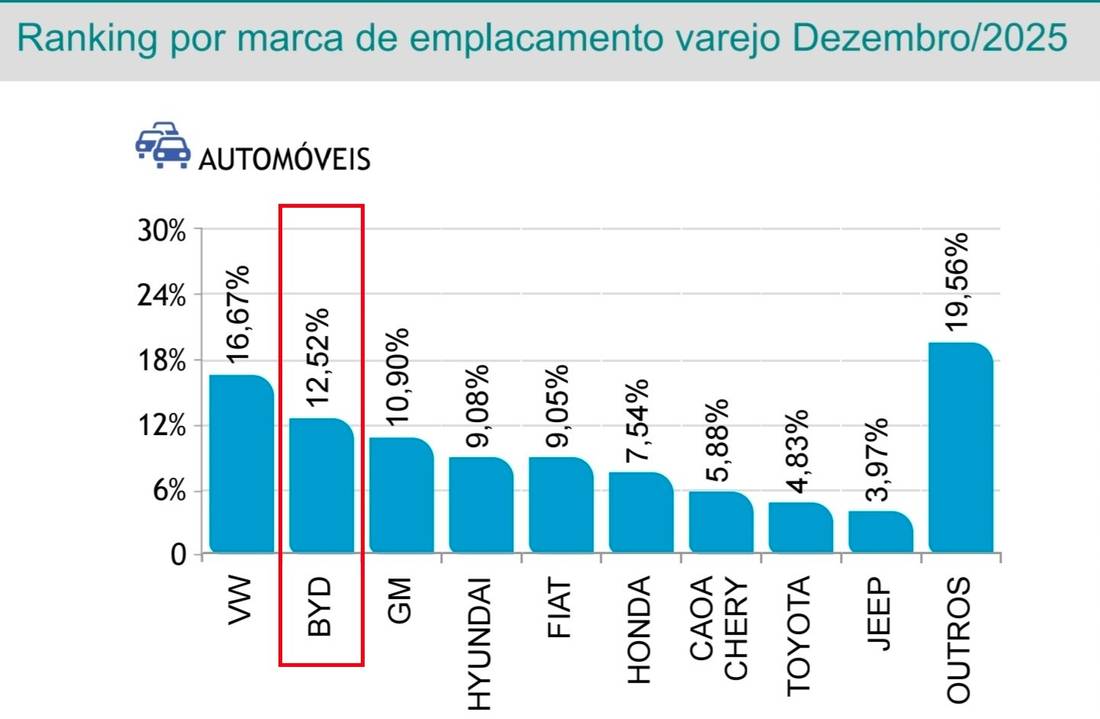 O fechamento do ano de 2025 consagrou a BYD em sétimo lugar entre as marcas de carros que mais emplacaram veículos leves (não comerciais) no Brasil, com 111.683 unidades registradas, o que garante também a participação de mercado com uma fatia de 5,59% de toda a indústria de automóveis. Considerando a soma com comerciais leves no acumulado de 2026, a greentech fica em oitavo lugar, ainda no Top 10, uma participação de 4,43% do mercado.