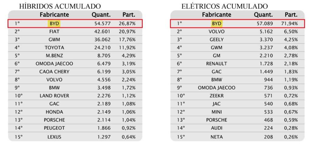 “Esse desempenho é fruto de uma estratégia clara, centrada no cliente e sustentada por investimentos contínuos em inovação e sustentabilidade. Foi assim que assumimos a liderança dos veículos eletrificados e passamos a disputar, de igual para igual, o topo do ranking geral, superando marcas tradicionais e consolidando a BYD como uma nova referência da indústria automotiva no Brasil”, completa o executivo.