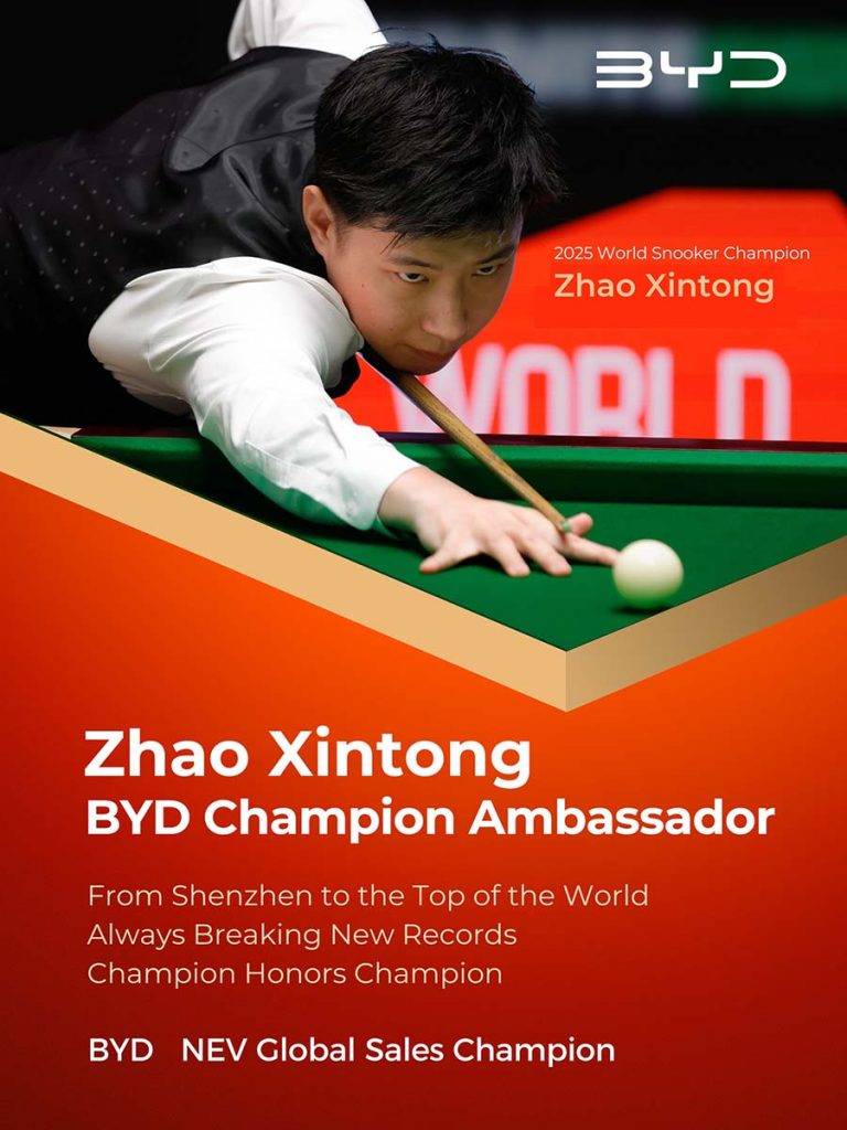 “Estou muito feliz em me tornar um embaixador da BYD, que fez parte da minha trajetória, desde as lembranças da infância na minha cidade natal até os dias de treinamento no Reino Unido”, celebrou Zhao. “Como atleta, entendo profundamente que por trás de cada título há perseverança e dedicação. O espírito de superação e a busca pela inovação da BYD se conectam intensamente com os valores que cultivamos no bilhar. Juntos, iremos em busca de novas conquistas”, acrescenta.